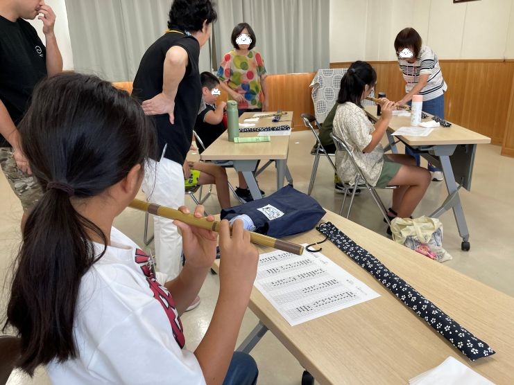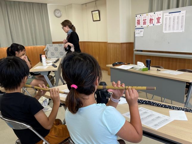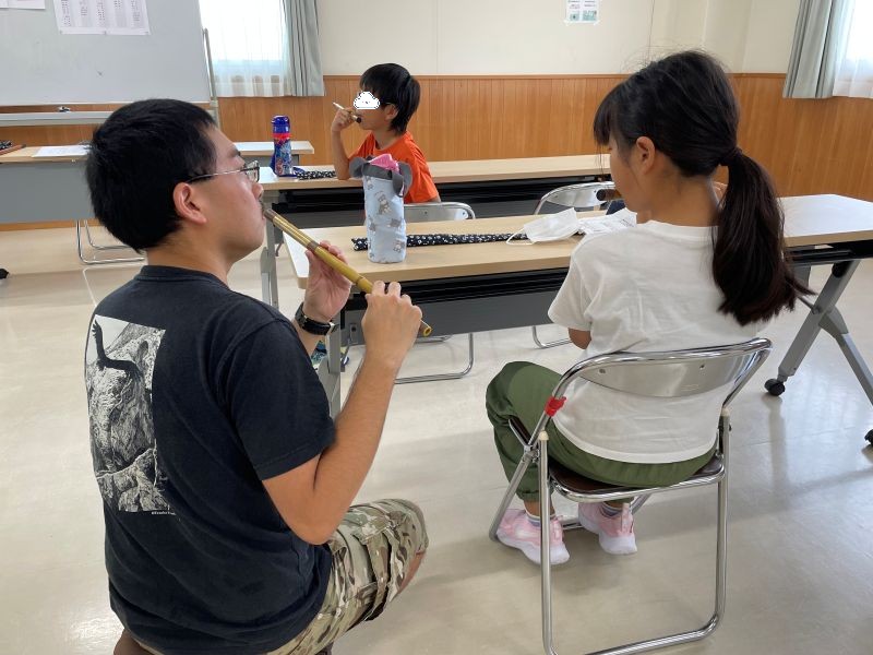 初めて触る日本古来の木管楽器。教えてもらった通りに息を吹き込んでも、なかなか音が出ない子も。 それでも二日目には、どの子もだんだんと音が出せるようになってきた!いつかお祭りでお囃子吹けたらいいね。